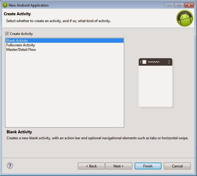 Langkah terakhir dalam membuat project adalah mengatur nama activity, nama layout, dan jenis navigasi. Jika teman-teman sudah selesai, klik Finish dan akan muncul tampilan seperti berikut.